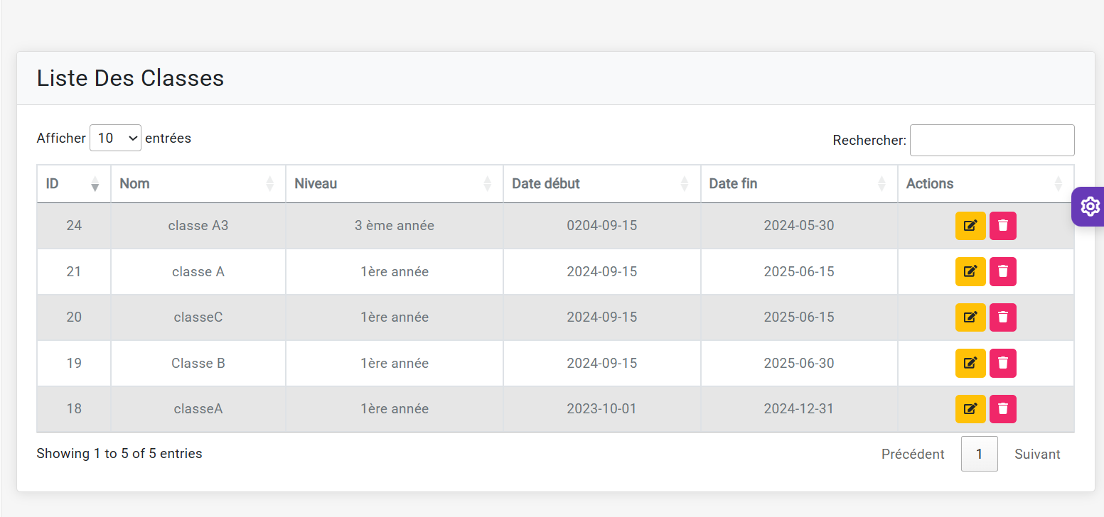 Créez et gérez les classes par niveau, assignez les élèves, planifiez les horaires et suivez les statistiques par classe.