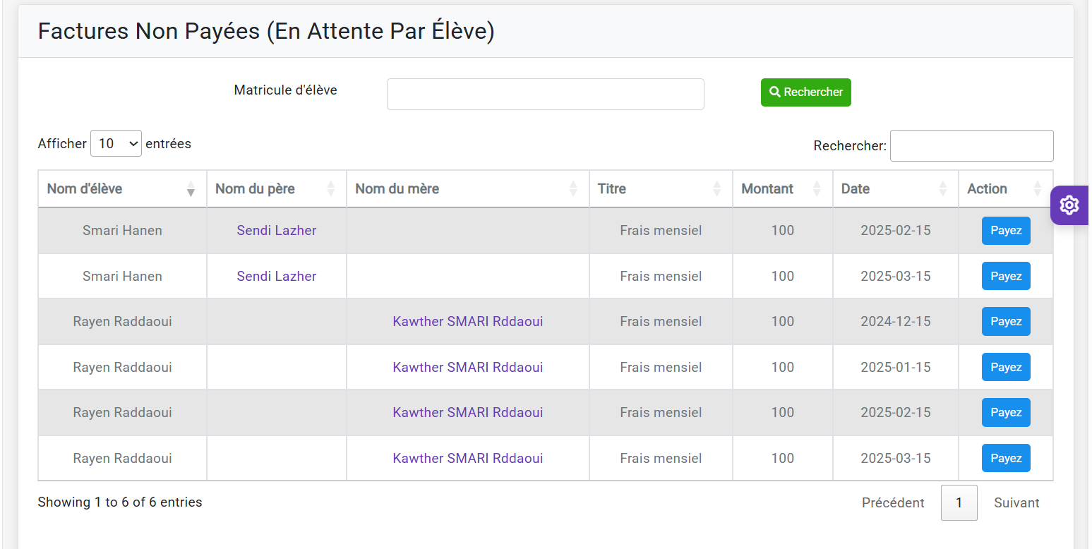 Gestion des frais de scolarité, paiements reçus, rappels et génération des reçus.